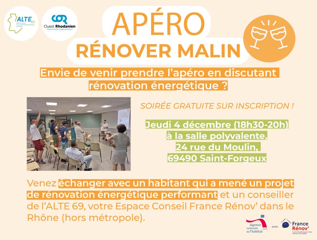 L’ALTE69 en partenariat avec la COR organise un apéro “rénover malin” le 4 décembre 2025 à la salle polyvalente au 24 rue du Moulin 69490 Saint-Forgeux.